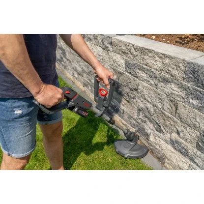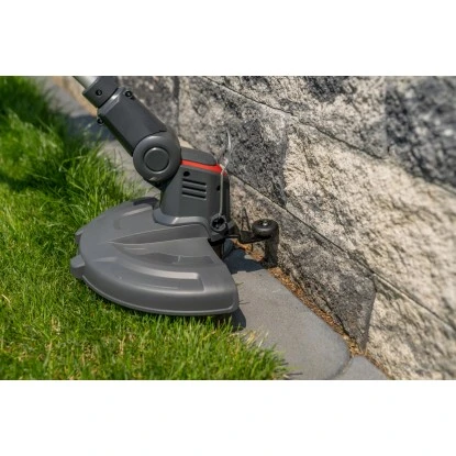 Mit nur 2,4 kg inkl. Akku und ergonomisch verstellbarem Zusatzgriff ist dieser Trimmer der hochmobile, leicht bedienbare Helfer für jeden Gartenbesitzer. Der flexible, schwenkbare Fadenkopf mit einer Schnittbreite von 25 cm und Pflanzenschutzbügel sorgt für präzises Trimmen an der Rasenkante, unter Büschen und an Wänden. Per Tipp-Automatik stellen Sie die optimale Fadenlänge während des Trimmens leicht ein, indem Sie mit dem Trimmerkopf auf den Boden tippen. Und der höhenverstellbare Alu-Teleskopschaft kann an die jeweilige Körpergröße individuell angepasst werden. Ein Klapp-Kantenrad unterstützt Sie zusätzlich beim sauberen Kantenschneiden.