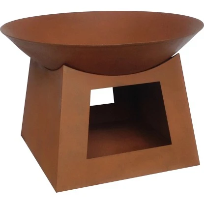 Die moderne Feuerschale mit Standfuß eignet sich zum Verbrennen von Brenngut oder Holz im Außenbereich. Sie hat einen Ø von 61,5 cm und eine Höhe von 41,5 cm. Gefertigt ist sie aus hitzebeständigem Stahl mit Rostoptik. Unterhalb der Schale befindet sich ein Fach zum Aufbewahren von Holzscheiten oder anderem Brennmaterial.