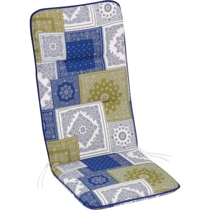 Die Sesselauflage hoch verfügt über einen strapazierfähigen Bezugsstoff, der aus 100 % Baumwolle (145 g/m²) besteht. Für den Kern wurde Schaumstoff mit thermisch verfestigter Vliesumhüllung von insgesamt 6 cm Stärke verwendet. Das Polster wirkt luftig, leicht und ist doch äußerst komfortabel. Für einen guten Halt sorgt das Elastikband an der Rückenlehne. Die Sesselauflage ist Handwaschbar bei 30 °C.