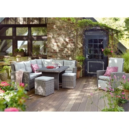 Die Kissenbox aus der vielseitigen Serie Vermont eignet sich optimal für die Aufbewahrung von Kissen, Auflagen und anderen Gartenutensilien. Sie können in ihr auch beispielsweise Gartengeräte, Grillzubehör oder Gartenspielzeug unterbringen. Die Gartentruhe besitzt ein leichtes, aber stabiles Aluminiumgestell und ist mit einem attraktiven Polyrattan-Geflecht in der Farbe Wave überzogen.