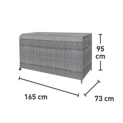 Die 95 cm x 165 cm x 73 cm (H x B x T) große Kissenbox bietet ein großzügiges Fassungsvermögen von 1.008 l. Eine integrierte Innentasche schützt das Verstaute zusätzlich. Für ein sicheres sowie leichtes Öffnen und Schließen der hochwertig verarbeiteten Auflagenbox sorgen die verbauten Gasfedern. Durch die beiden Rollen können Sie die Allzwecktruhe einfach verschieben und so im gesamten Garten wie auch auf Balkon und Terrasse benutzen.