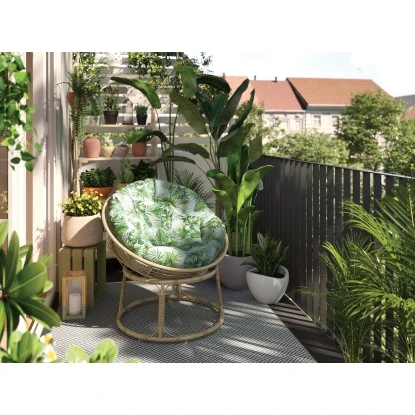 Der Lounge-Sessel Lindale stellt eine gemütliche Sitzgelegenheit für Außenbereiche dar. Er lässt sich im Garten, auf dem Balkon oder auf der Terrasse nutzen. Die runde Form mit den Armlehnen bietet einer Person bequem Platz. Hergestellt ist der Gartensessel aus Weidenholz in der Farbe Natur in Kombination mit einem Stahl-Gestell. Zur Komplettierung des Sitzmöbels gehört ein rundes Kissen zum Lieferumfang, das gleichzeitig Sitz- und Rückenpolster bildet. Es besitzt einen Bezug aus 100 % Polyester im modernen Dschungel-Print mit den Grundfarben Weiß und Grün. Die Füllung besteht aus Polyester und Polyspun. Insgesamt stellt der Armsessel die Abmessungen von ca. 79 cm x 93 cm x 83,5 cm (H x B x T) zur Verfügung.